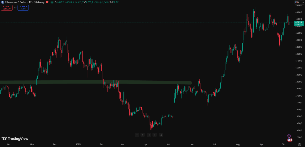 Nach dem Tief im April setzte Ethereum eine dynamische Aufwärtsbewegung fort und markierte im Spätsommer Hochs knapp unter 4.800 USD. Seither läuft eine Konsolidierung auf hohem Niveau, während Rückläufe oberhalb der zuvor kritischen Schlüsselzone 3.000–3.200 USD aufgefangen wurden. Mehrere Tests dieses Bereichs wurden verteidigt, anschließend zog der Kurs wieder an. Der aktuelle Spot liegt um 4.509 USD.