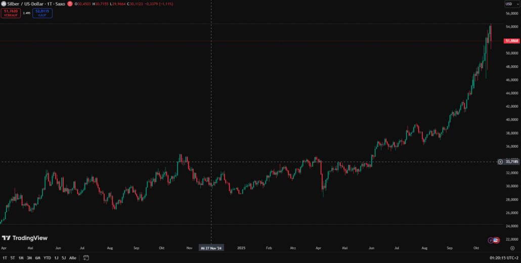 Im laufenden Jahr zeigt sich diese Entwicklung besonders deutlich. Der Goldpreis ist seit Januar von rund 80 Euro pro Gramm auf aktuell etwa 117 Euro pro Gramm im Oktober gestiegen. Das entspricht einem beeindruckenden Zuwachs von rund 45 Prozent. Auch Silber konnte deutlich zulegen von 0,95 Euro pro Gramm auf etwa 1,43 Euro pro Gramm, was einem Anstieg von über 43 Prozent entspricht.